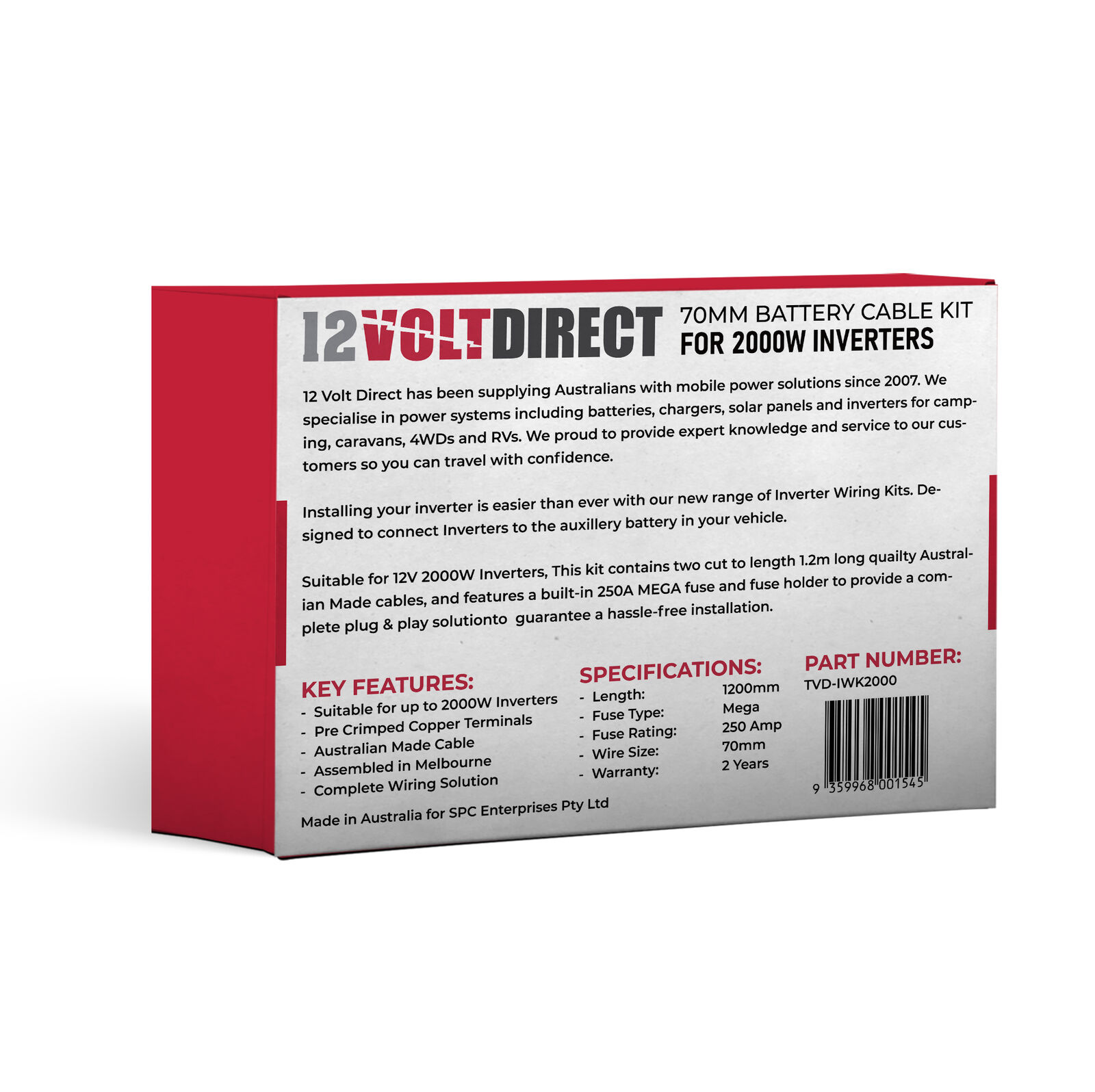 - Suitable for 12V 2000W Inverters, This kit contains two cut to length 1.2m long quailty Australian Made cables, and features a built-in 250A MEGA fuse and fuse holder to provide a complete plug & play solution to guarantee a hassle-free installation.