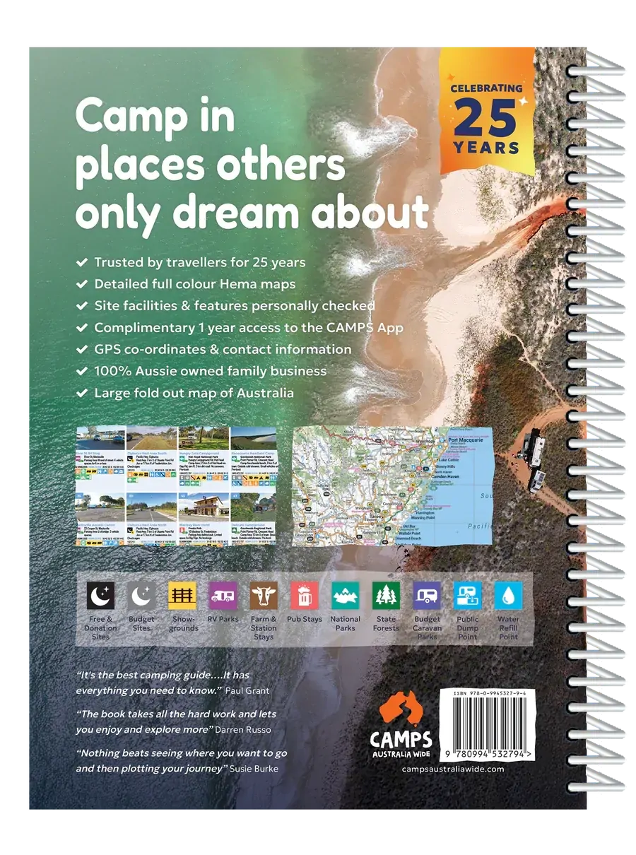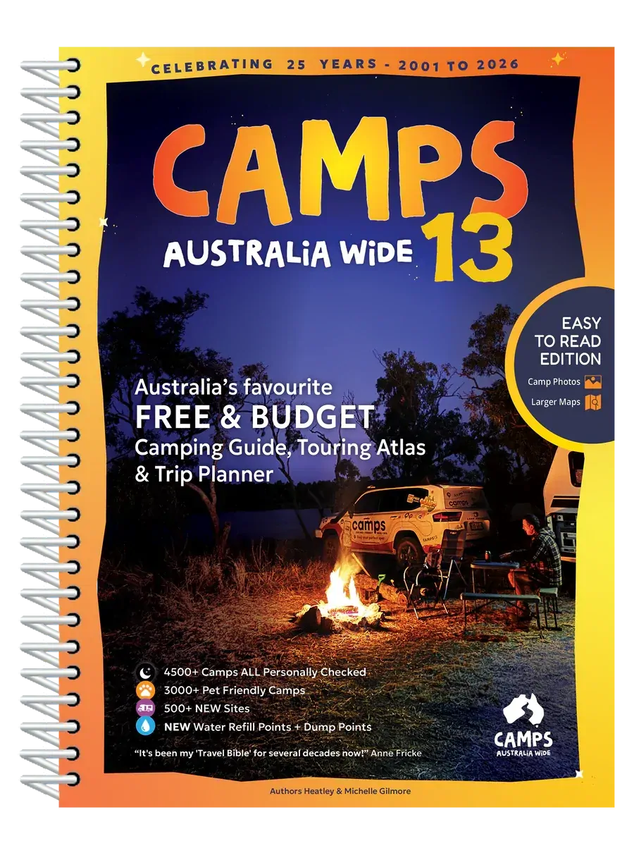 The Camps 13 Easy to Read Edition (B4) features over 4,250 free and low-cost campsites across Australia including 500 new sites all personally checked by the Camps Australia Wide team. This special 25th Anniversary Edition includes full-colour campsite photos and larger maps for easy reading, making it perfect for travellers who want both detail and convenience.