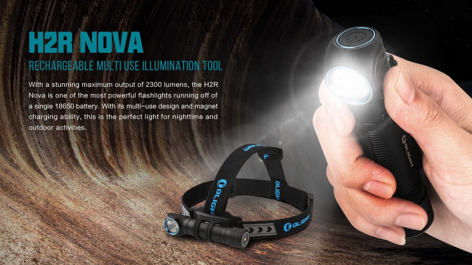 The H2R Nova is Olight's first 18650 battery headlamp/angle light with a massive 2300 ANSI rated lumens. The CREE XHP50 LED in combination with a TIR bead lens delivers a perfectly balanced and even beam for maximum usable light when you need it. Magnetic recharge and battery included.