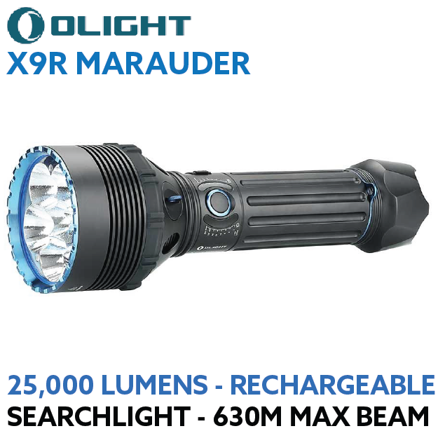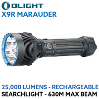 The X9R Marauder is the largest and highest output flashlight ever produced by Olight reaching an incredible 25,000 lumens.