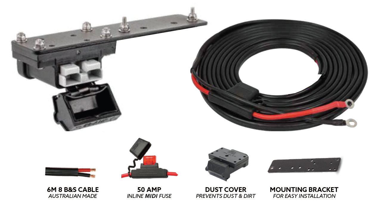 This kit consists of everything you need to install an Anderson plug on your car for towing with a professional finish. 6m of heavy Australian Made 6 or 8 B&S gauge cable pre-wired with a maxi fuse holder with all joins heat shrunk and crimped.
