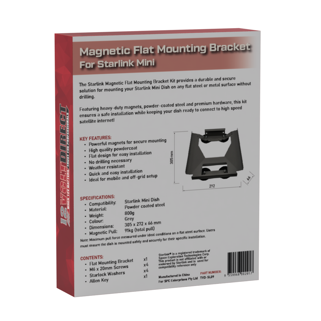 The Starlink TVD-SL09 Magnetic Flat Mounting Bracket Kit is the perfect solution for mounting your Starlink Mini Dish securely on any flat surface. Featuring powerful magnets, this kit ensures a stable and reliable setup, whether youre on the go in an RV, truck, or at a remote location. Its durable construction provides lasting performance in various weather conditions, making it ideal for both mobile and off-grid use. The easy-to-install bracket allows for flexible mounting options, ensuring hassle-free deployment and removal.